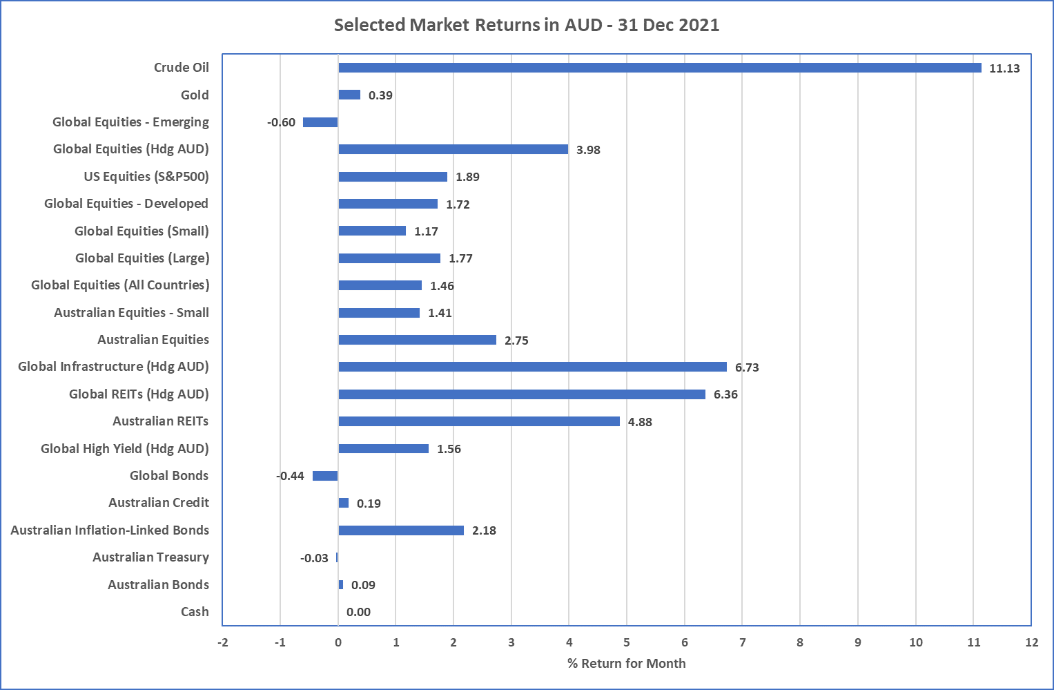 - For the 2021 year, all equity markets finished up in AUD terms, whilst most investment grade bond markets finishing flat or down. 2021 was another year for risky assets in this low interest rate environment.