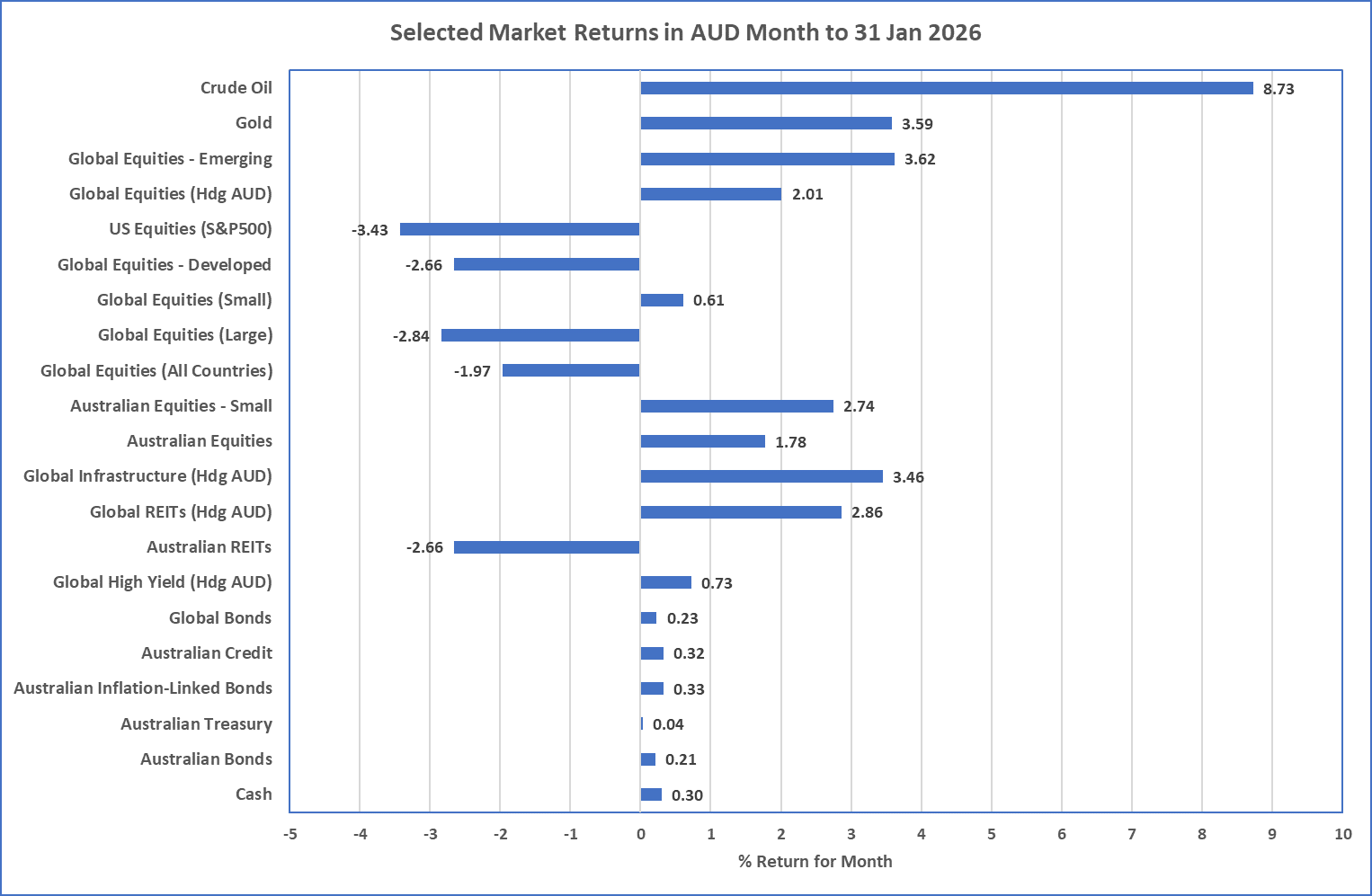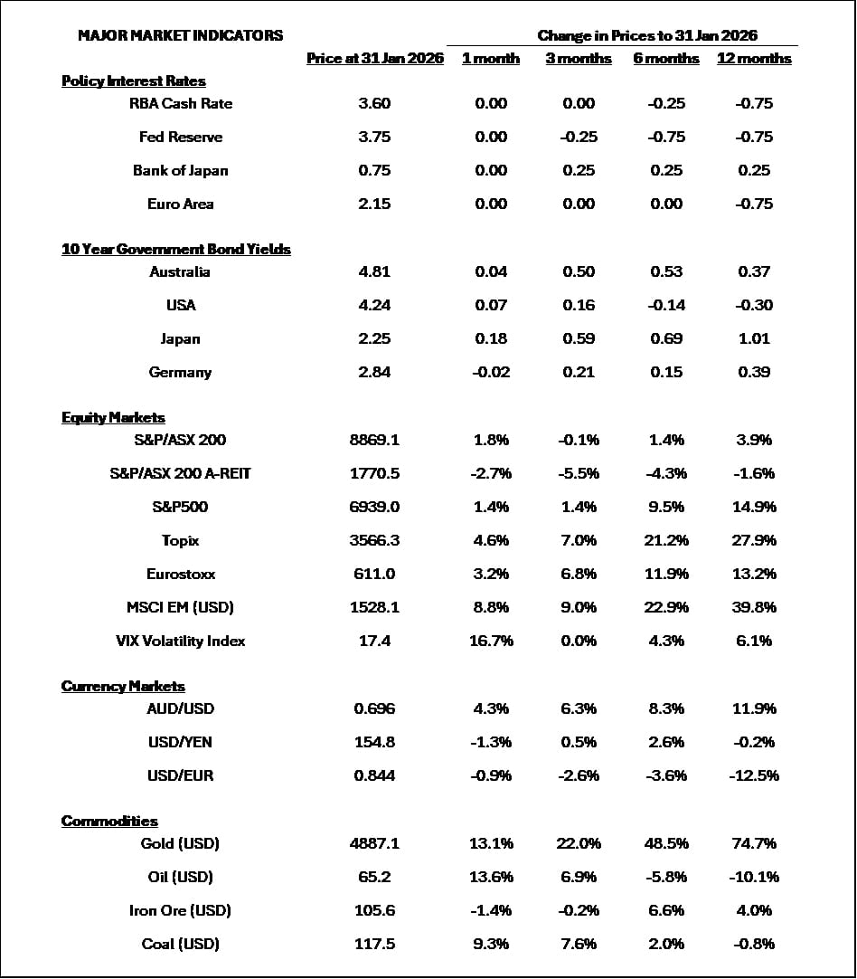- Economic and investment conditions remained broadly constructive in January. The month was characterized by moderating inflation, resilient labour markets, and decent corporate earnings. However, these were offset by continuing geopolitical and policy uncertainty. This uncertainty led to a much weaker US Dollar which declined against all currencies including the Australian dollar.