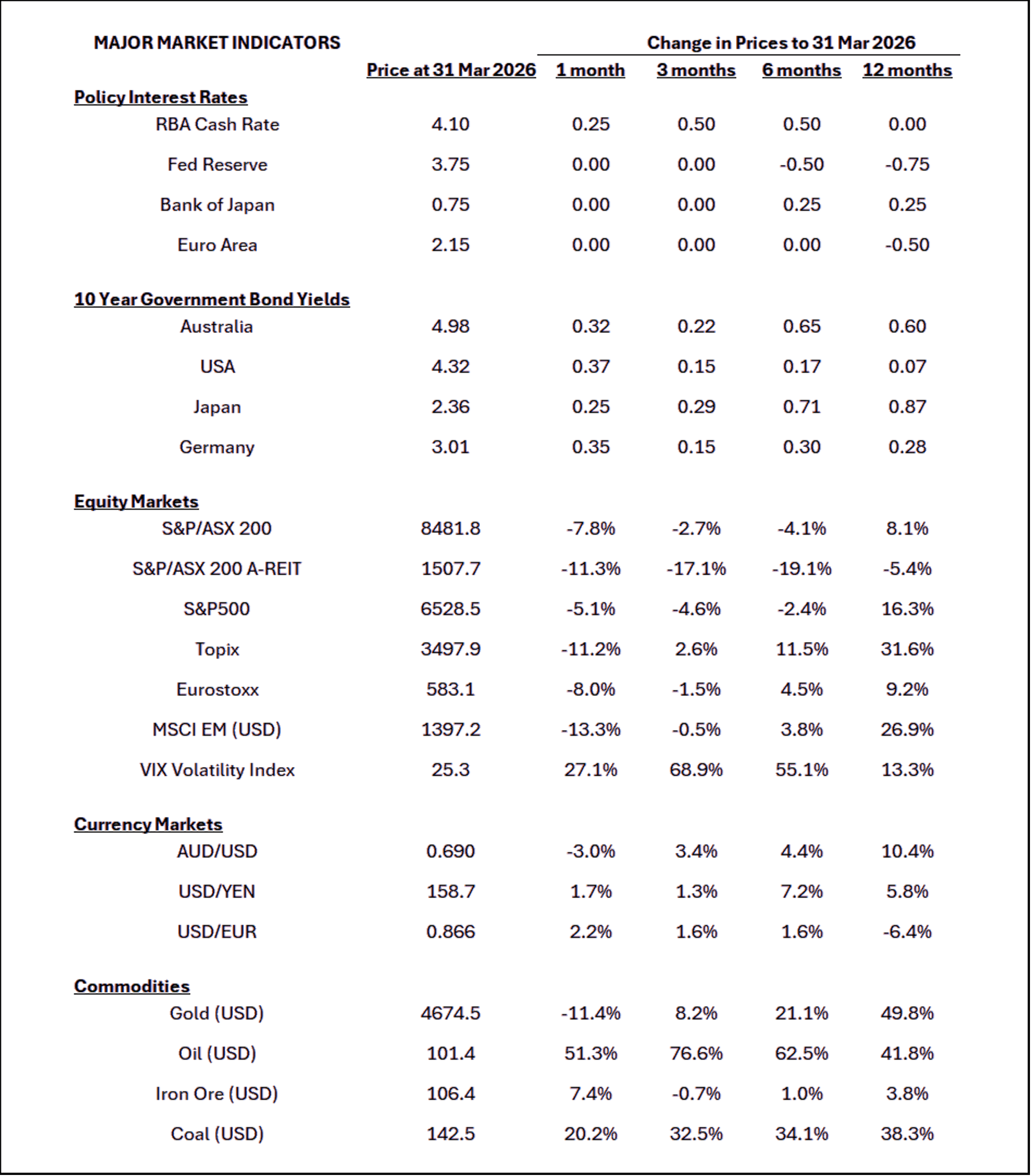 - Australian markets have felt the energy price increases substantially. Inflation was already high, at 3.7%, and the higher energy prices means it will stay higher for a little longer yet. Unsurprisingly, the Reserve Bank increased its cash rate for the second time in 2026, leaving it at 4.1%.