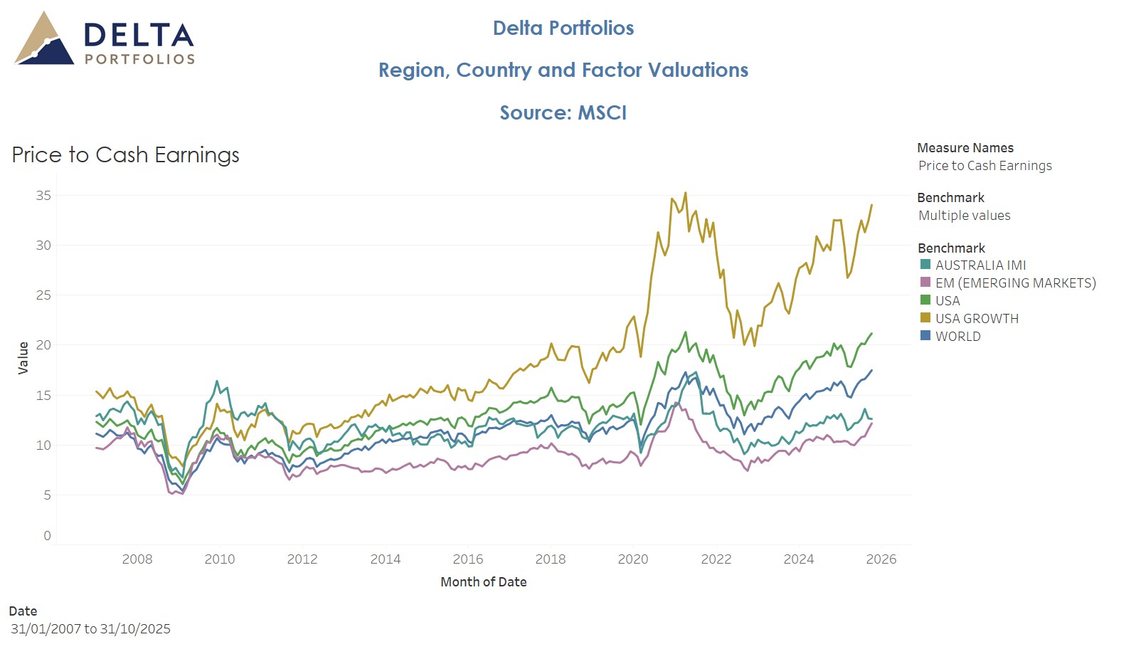 - Overall, global economic conditions appear mixed and lacking clear direction. Despite this, global sharemarkets, including Emerging Markets, continued their strong positive momentum producing above-average returns. Much of this relates to the Artificial Intelligence boom which is also resulting in 1999-like sharemarket valuations that are likely unsustainable unless earnings growth is above long-run averages.