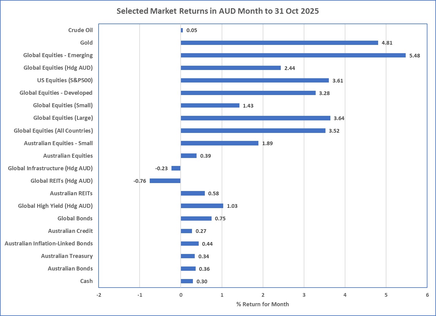 - Overall, global economic conditions appear mixed and lacking clear direction. Despite this, global sharemarkets, including Emerging Markets, continued their strong positive momentum producing above-average returns. Much of this relates to the Artificial Intelligence boom which is also resulting in 1999-like sharemarket valuations that are likely unsustainable unless earnings growth is above long-run averages.