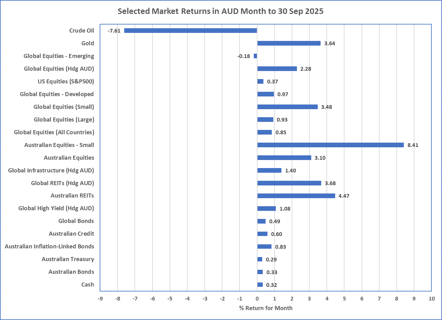 - REITs and Small Companies were the standout performers during September, but all major asset classes produced positive returns except emerging markets which were flat.