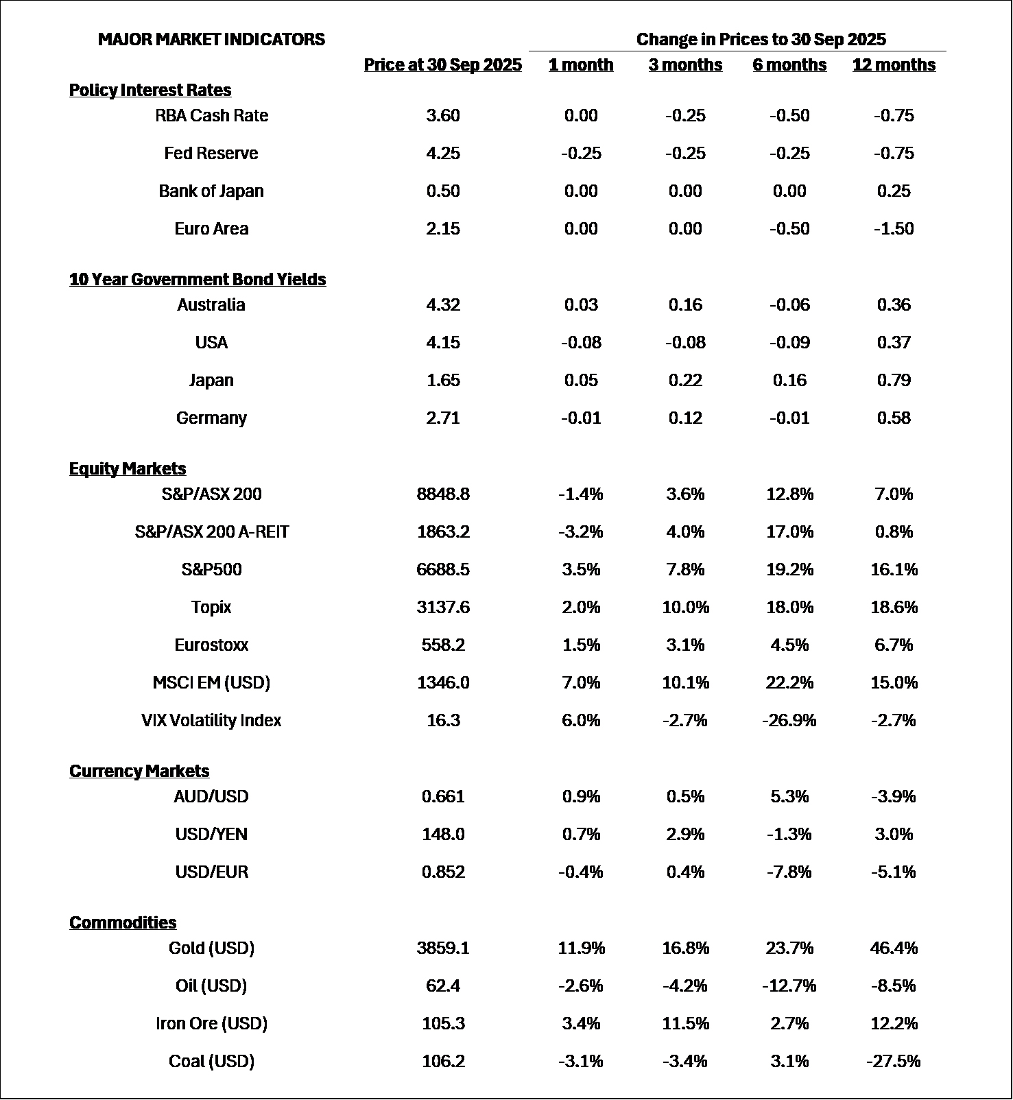 - Inflation in Australia reduced to 2.1% in the June quarter and current pricing suggests the Reserve Bank of Australia will probably only produce one more 25bps rate cut over the next 6 months as economic data has been stronger than previously expected. With the USA starting to produce weaker data, like unemployment, further rate cuts may occur, although the caveat is around high inflationary effects expected from tariffs.